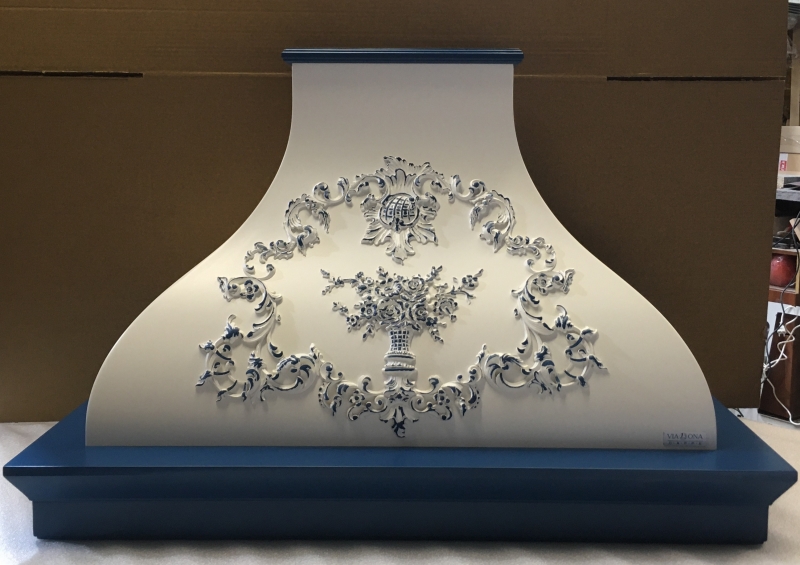На фото представлена вытяжка в цвете купола RAL 1013, деревянное обрамление из Бука цвет RAL 1013 патина небесный синий.